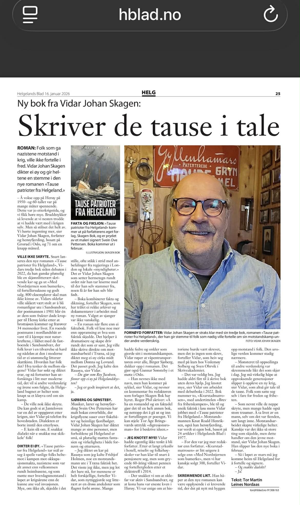 Avisoppslag om Tause patrioter fra Helgeland og forfatteren Vidar Johan Skagen.